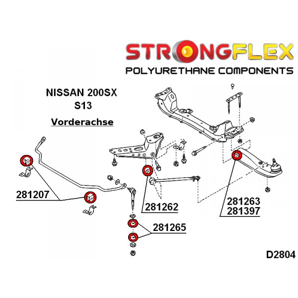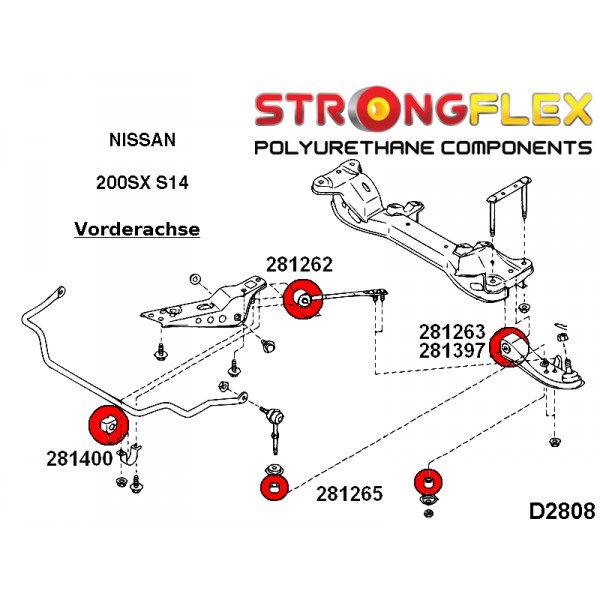 Das Material ist deutlich widerstandsfähiger als die original Nissan Buchsen, um die Verwindung des Fahrwerks zu minimieren. Da die original Buchsen nicht einzeln angeboten werden (nur als komplettes Set mit Streben, etc.) sind die PU Teile der optimale Ersatz.