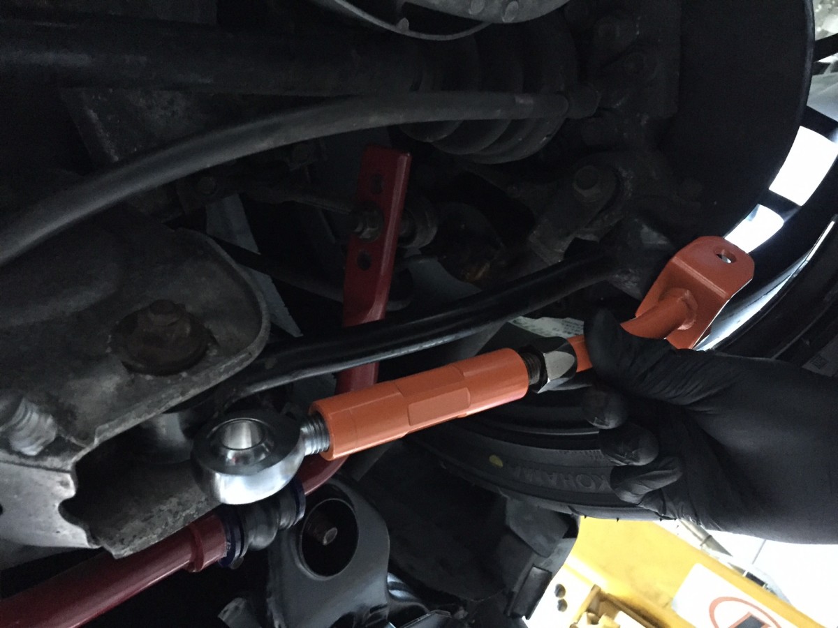 Durch die Verstellung der Strebenlänge kann der Sturz an der Hinterachse angepaßt und so die Traktion, der Reifenverschleiß und Freigängigkeit der Räder optimiert werden.