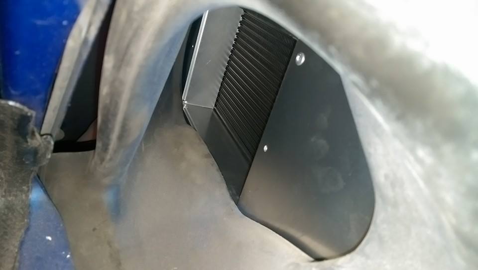 Der Einbau erfolgt im direkten Austausch gegen den serienmäßig montierten Ladeluftkühler (Turbo) oder das Luftleitblech (Sauger) hinter dem Lufteintritt vor dem rechten Hinterrad. Durch die Montage an den bereits vorhandenen Befestigungspunkten sind keine zusätzlichen Halterungen oder Verschraubungen notwendig. Die Trägerplatte ist paßgenau und fahrzeugspezifisch gefertigt.